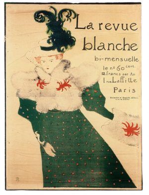 - Henri de Toulouse-Lautrec, Plakat La Revue blanche, 1895, Lithografie: olivgrüne Zeichnung und Blau, Rot, Schwarz; Tusche, Kreide, Schaber (Sammlung Coninx, Zürich)