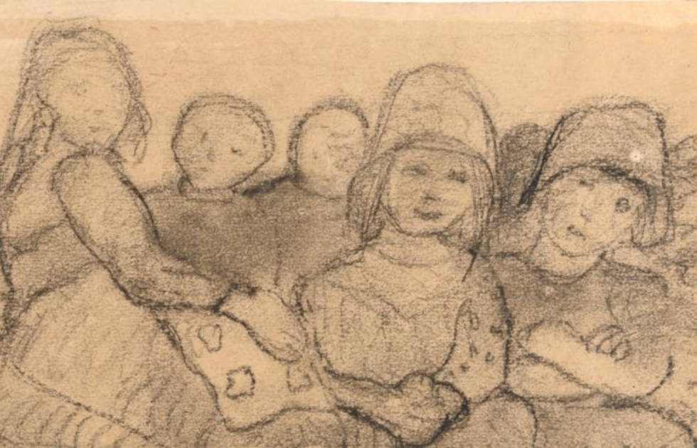 „Sie haßt das conventionelle u. fällt nun in d. Fehler alles lieber eckig, häßlich, bizarr, hölzern zu machen. Die Farbe ist famos, aber die Form? Der Ausdruck! Hände wie Löffel, Nasen wie Kolben, Münder wie Wunden, Ausdruck wie Cretins. Sie ladet sich zuviel auf. 2 Köpfe 4 Hände auf kleinster Fläche, unter dem thut sies nicht u. dazu Kinder! Rath kann man ihr schwer ertheilen, wie meistens.“