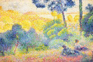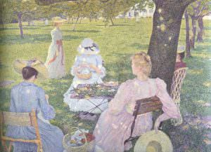 - Théo van Rysselberghe, Später Vormittag im Juli (Der Obstgarten oder Familie im Garten), 1890, Öl auf Leinwand, 115,5 × 163,5 cm (Kröller-Müller Museum, Otterlo)