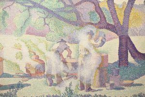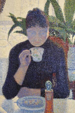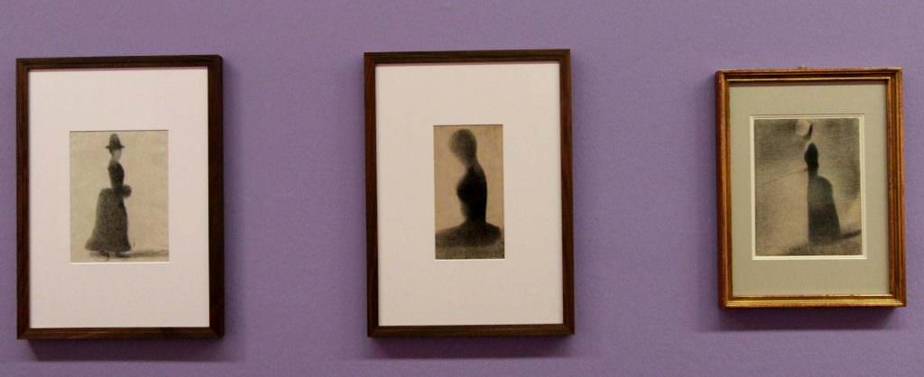 Die Ausstellung beginnt mit einer Zeichnung von Georges Seurat, dem Erfinder des Pointillismus: „Beim Sticken (Porträt der Mutter)“ (1882/83, The Metropolitan Museum of Art, New York). Seurat verwendete schwarze Conté-Kreide und raues Papier, wodurch schon durch die Materialwahl eine punktartige Struktur entsteht. Gemeinsam mit Paul Signac (1863–1935) entwickelte er 1885/86 den Pointillismus, mit dem beide zwischen Mai und Juni 1886 die achte und letzte Impressionisten-Ausstellung im wahrsten Wortsinn aufmischten (→ Postimpressionismus | Pointillismus | Divisionismus).