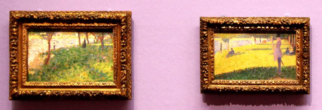 Dass sich Signac in den folgenden Jahren vor allem als Maler von Landschaftsbildern hervortun würde, war zu diesem Zeitpunkt noch nicht entschieden. Stattdessen rang er freundschaftlich mit Seurats „Ein Sonntagnachmittag auf der Insel La Grand Jatte“ (1884–1886, The Art Institute of Chicago). Dieses kapitale Werk Seurats wird nicht mehr entliehen, drei Ölskizzen aus der National Gallery in London und weitere drei Zeichnungen für Figuren stehen stellvertretend für das Erstlingswerk dieser Stilrichtung. Die Skizzen sind in avanciert impressionistischer Weise gemalt, kaum vorstellbar, dass der Künstler mit der Überarbeitung seiner Komposition zu einem pointillistischen Bild Monate beschäftigt war. Es dürfte wohl auch diese Mühsal, mit einem spitzen Pinsel all diese Schichten an Farbpunkten aufzutragen, gewesen sein, die Camille Piassarro von einem Unterstützer der ersten Stunde reumütig zum orthodoxen, oder wie er es nannte, „romantischen“ Impressionismus zurückkehren ließ. Nach dem vorzeitigen Tod von Seurat schien das Ende der Bewegung gekommen. Pissarro reiste nach London und baute dort seine Parkansichten wieder dicht und mit einer direkten, pastosen alla prima Malerei auf.
