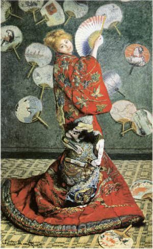 - „Japonnerie / La Japonaise [Camille im japanischen Kleid / Die Japanerin]“ 1876 (Museum of Fine Arts, Boston, das er für 2.000 Francs aus der Ausstellung verkaufen konnte)