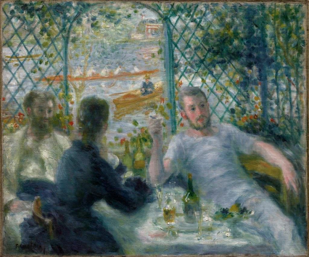 - Pierre-Auguste Renoir, Mittagessen im Restaurant Fournaise (Mittagessen der Ruderer), 1875, Öl auf Leinwand, 55 × 65.9 cm (Art Institute of Chicago, Collection Potter Palmer)